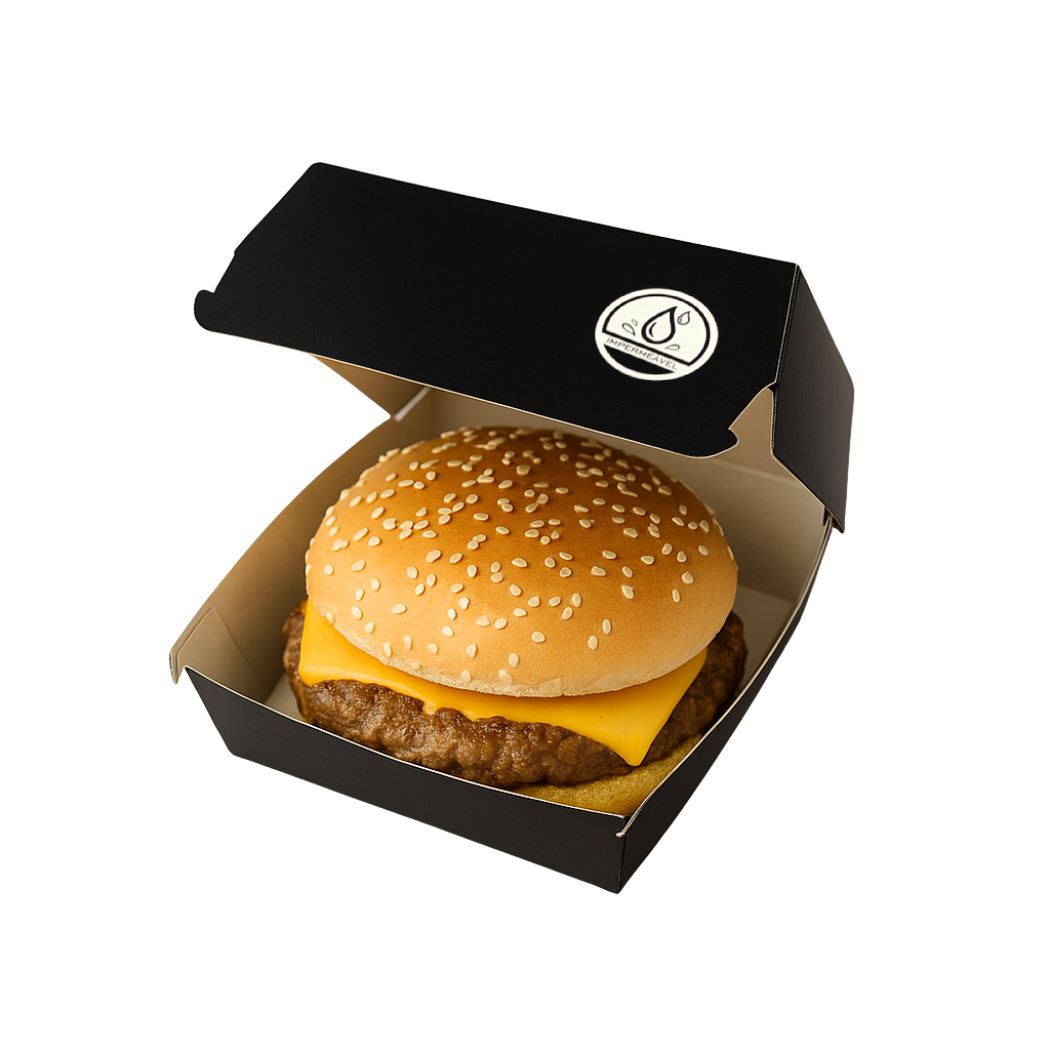 Ideal para hamburguerias, food trucks e lanchonetes, essa embalagem é fabricada em papel cartão duplex 250g/m², um material sustentável que substitui o isopor (EPS), oferecendo um visual moderno e mais responsável com o meio ambiente.